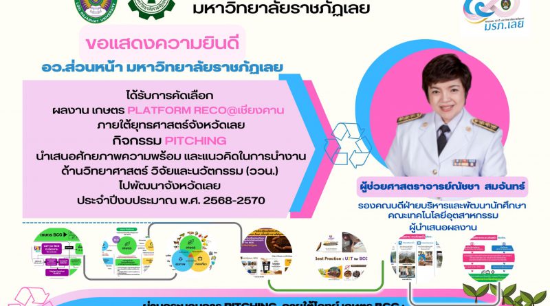 อว.ส่วนหน้า มหาวิทยาลัยราชภัฏเลย ได้รับคัดเลือกจัดทำโครงการพัฒนาศักยภาพจังหวัดด้วยวิทยาศาสตร์ วิจัยและนวัตกรรม ประจำปีงบประมาณ พ.ศ.2568-2570 ผ่านกระบวนการ Pitching ภายใต้โจทย์ เกษตร BCG : การผลิตวัสดุปลูกคุณภาพสูงด้วยของเหลือใช้ผลผลิตทางการเกษตรตามอัตลักษณ์ของพื้นที่จังหวัดเลย โดยผู้ช่วยศาสตราจารย์ณัชชา สมจันทร์ สาขาวิศวกรรมการจัดการอุตสาหกรรม คณะเทคโนโลยีอุตสาหกรรม