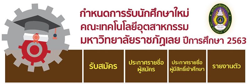 คณะเทคโนโลยีอุตสาหกรรม มหาวิทยาลัยราชภัฏเลย จะดำเนินการรับสมัครนักศึกษาใหม่ ระดับปริญญาตรี ภาคปกติ (ประเภทรับตรง) ประจำปีการศึกษา 2563 เพื่อเข้าศึกษาในมหาวิทยาลัยราชภัฏเลย จังหวัดเลย ดังรายละเอียดต่อไปนี้ << อ่านประกาศเพิ่มเติม >>